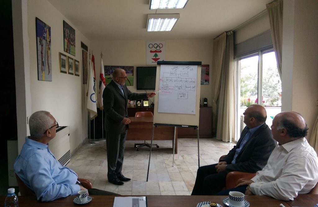 During his week-long stay in April 2016, Damjan Pintar worked closely with members of the Lebanese Olympic Committee and local sports federations representatives, including Mazen Ramadan (LOC member, chairman of Olympic Solidarity, President of the Kayak Federation) to learn about the current situation of sport in Lebanon. In the course of their working sessions, the participants performed a SWOT analysis to summarize their findings and set goals for the future.
